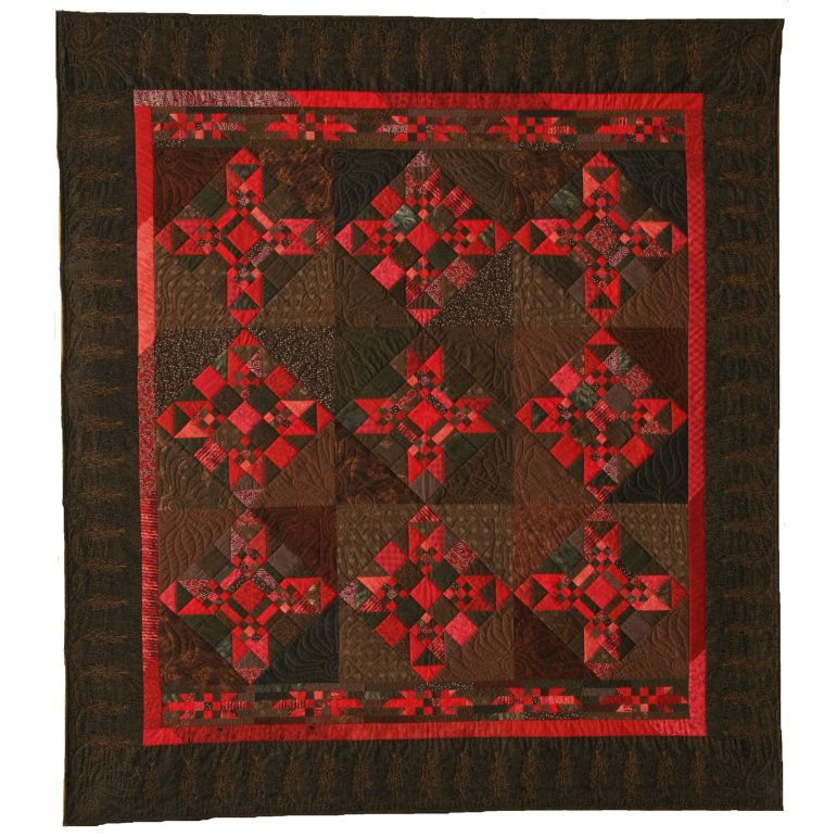 The design for the quilt "O Mexico" represents a spirited journey from darkness into light. The traditional Mexican block is transformed and altered throughout the quilt finishing with a border motif taken from a traditional Mexican weaving pattern. There is a tribe of Indians in Mexico that are said to be the last tribe in North America that have maintained their pre- Columbian traditions. These are the Huichol Indians of the Sierra Madre Mountains. The Huichol believe that we are created from the elements of the natural world – fire, water, earth and sky. Each of us is a universe in miniature reflecting the spiritual and natural world. All answers are inside us – all is perfectly arranged. Finished Size: 84 x 93" |