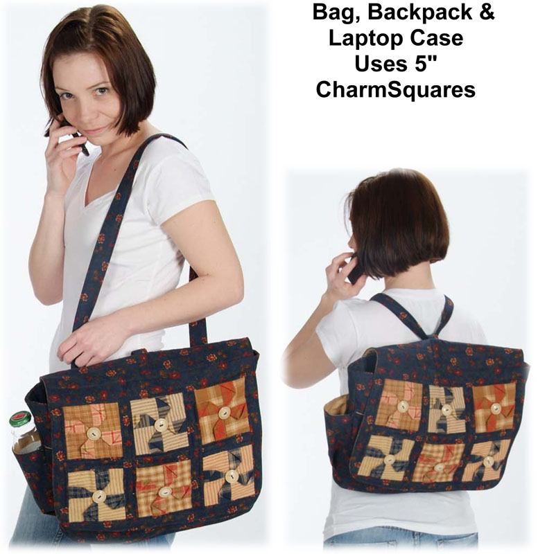 The Messenger-Girl Bag is convertible – wear it over your shoulder when shopping, over your head and shoulder when you bike or convert it to a backpack for longer expeditions. The bag holds up to a 16" laptop and includes two big easy-access zipped pockets under the front flap and inside. The water bottle or cell phone pocket and the notebook pocket are features you’ll love. A great bag for new Moms too! Skill Level - Intermediate and up This pattern uses 5” squares. Measures 13" x 16" |