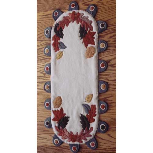 Bring the rich colors of fall into your home with an easy to sew 33" x 16" wool felt table runner. No hand sewing required! Just adhere the leaf shapes onto the wool felt and free-motion machine applique with a varigated thread. |