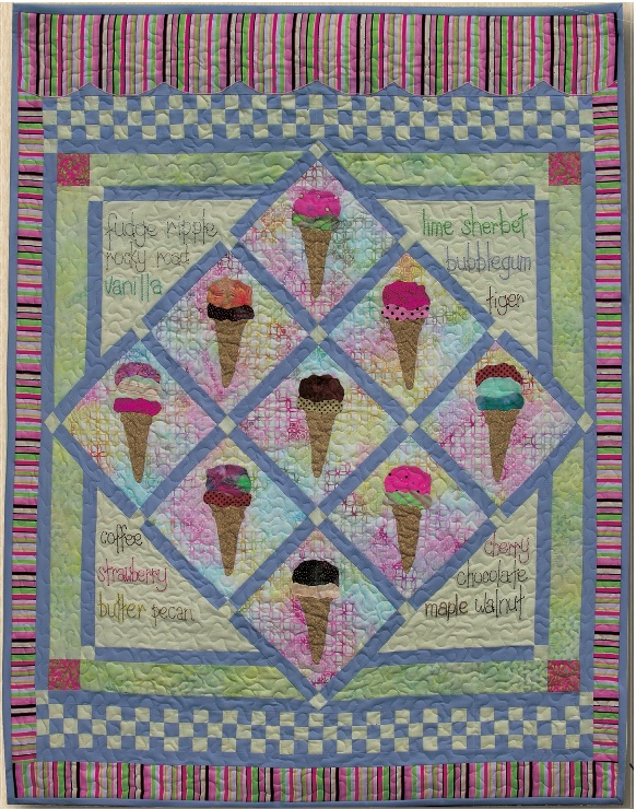 Yummy stitchery and applique in mouth watering colors. Finished size: 52” x 44” |