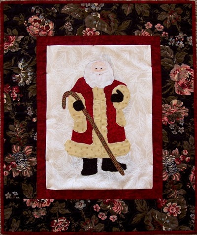 Quilting Santa is carrying his own quilt to keep him warm delivering toys on Christmas Eve. |