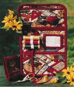 Thimble pouch, scissors on a cord tuck into zipped pocket for storage, unwind thread while held in elastic pin cushion. |