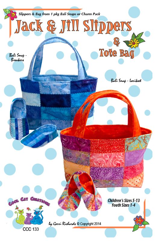 Here are two styles of children"s slippers as well as a little tote bag, perfect gifts! Make both a pair of slippers and a tote bag using 1 package of Bali snaps and charm squares. Full sized templates included for all sizes and both styles boys & girls. Child's size 5-13 and youth sizes 1-4. |