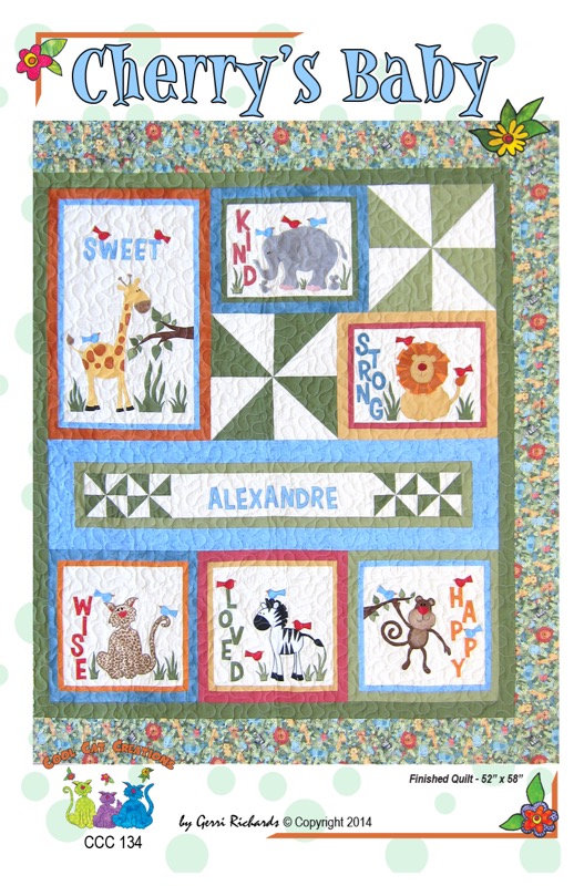 This baby quilt measures 52" x 58". The full alphabet is included, allowing you to personalize the name and the animal blocks. All applique pieces are full sized and reversed for use with fusible web. Lots of colour illustrations are included. |
