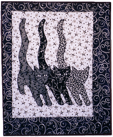Measuring 20" x 24.5", Cat Parade is an appliqué wall hanging for feline lovers. Featuring three bright-eyed cats, it looks just as good in rusts or funky bright prints as it does in black-and-white. Pattern includes instructions for Satin Stitch Appliqué, Invisible Machine Appliqué and hand appliqué. |