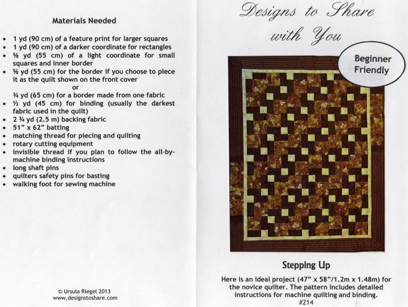 Here is an ideal project (47" X 58"/1.2m X 1.48m) for the novice quilter. The pattern includes detailed instructions for machine quilting and binding. |