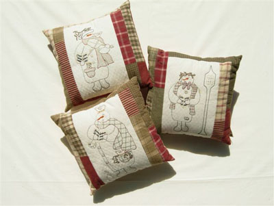 These Snow Trio Pillows are soft, warm & sure to bring a smile! Measuring 14" square, each pillow features a musical snowman stitched on Sandcastle fabric, then bordered in flannel plaids & buttoned in the back. Choose from a singing snowman, a snowman who plays the horn or one that plays violin. All patterns include a thread chart & use four basic stitches: Backstitch, Running Stitch, French Knot & Lazy Daisy. Add a touch of whimsy to your winter decor with a Snow Trio Pillow. |